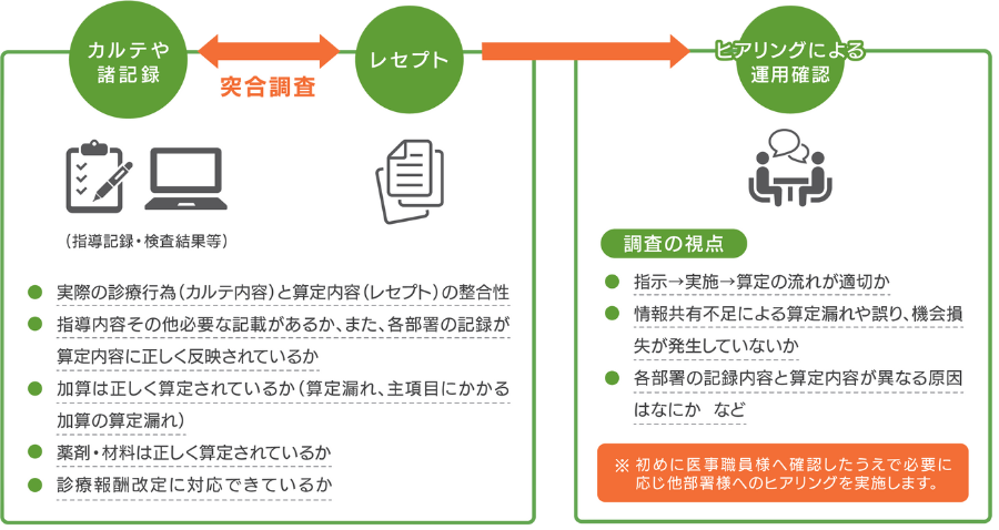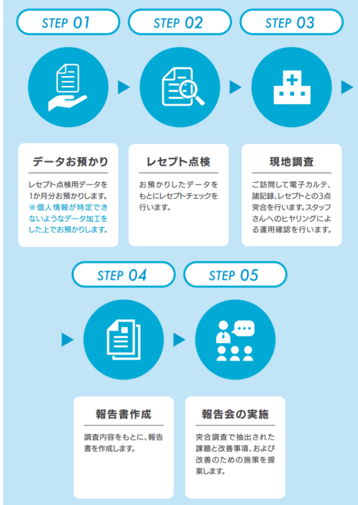 経験豊富なレセプト請求のスペシャルリストが貴院へ訪問し、レセプト点検をしながらレセプト業務の指導を行うサービスです。算定誤りを解消し、適正な診療報酬請求で、医療機関の増収に貢献します。